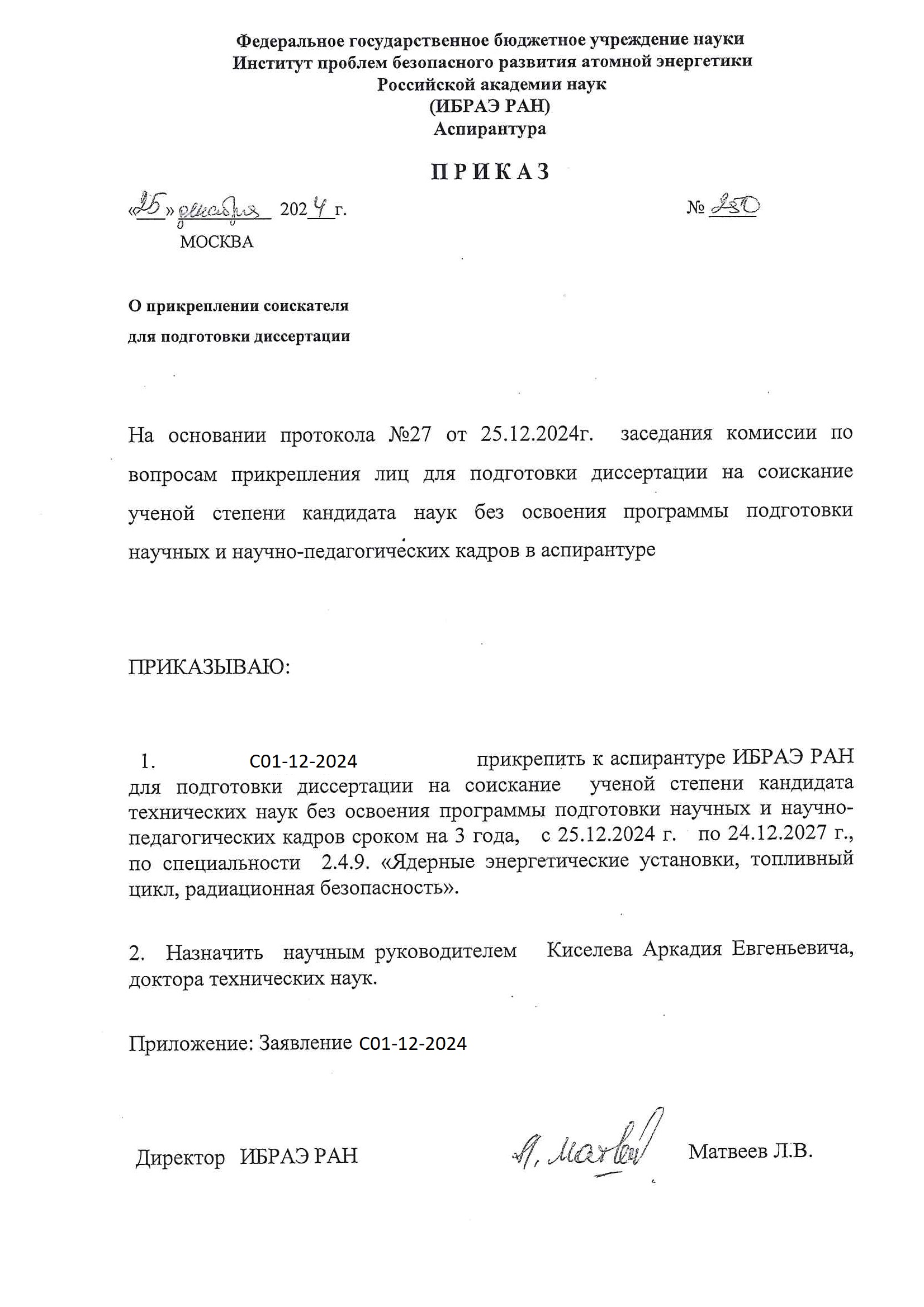 Перечень образовательных программ и количество мест для приема в аспирантуру ИБРАЭ РАН очной формы обучения по научным специальностям на 2025/26 учебный год за счет средств субсидии из федерального бюджета на выполнение государственного задания: